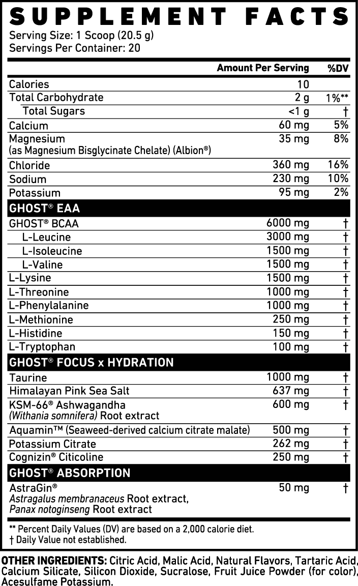 Our intra-workout POWERHOUSE. Packed with an EPIC 10G total EAAs per serving, plus Astragin® for absorption... oh yeah, and we threw in fully efficacious doses of Taurine, Cognizin® and KSM66® for an added focus and hydration play. Enjoy GHOST® INTRA with us around the clock. We sip ours at the gym, at the office and even with the squad before a night out.